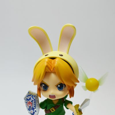 First off, this figure comes with SO MANY accessories! Easily the most of any Nendoroid in our collection currently. Fans of the game will be happy to see not only his signature Hylian Shield and Master Sword, but also masks such as the Gorgon Mask, Deku Mask, and others! He also comes with a potion bottle, his companion Tatl, and, my personal favorite, his bunny ears!
